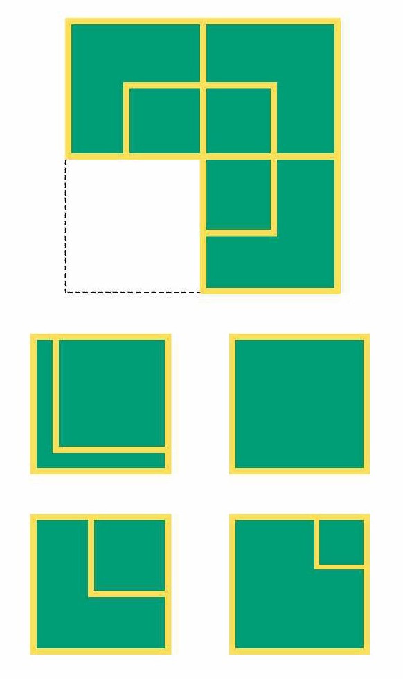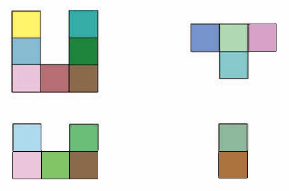 下面哪两部分图案可以组成一个完整的正方形?请把它们连一连。
