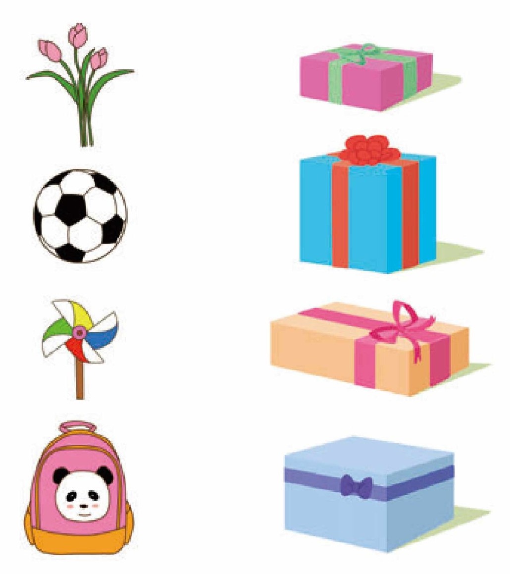 今天是毛毛的生日,小伙伴们准备了各种各样的礼物,请你根据每件礼物的大小,将它们装进合适的礼物盒里吧!