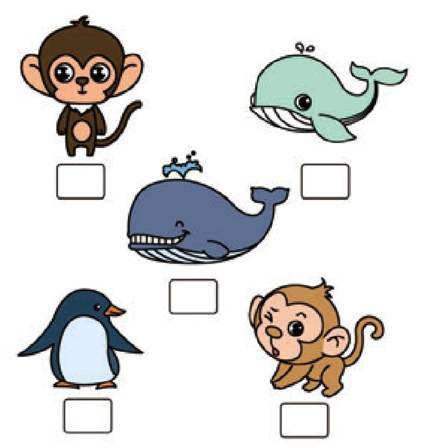 下面的动物有两组两两对应。仔细观察动物的种类,找出没有对应的一个,并在其对应的方框内涂色。
