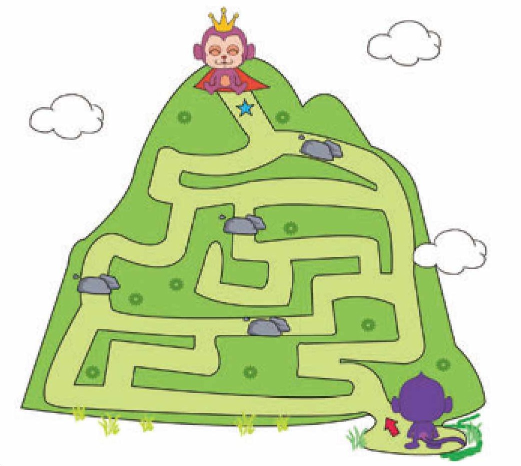 猴山的路太难走了!猴大王住在山顶上,你能帮助小猴子顺利地找到猴大王吗?请画出路线。