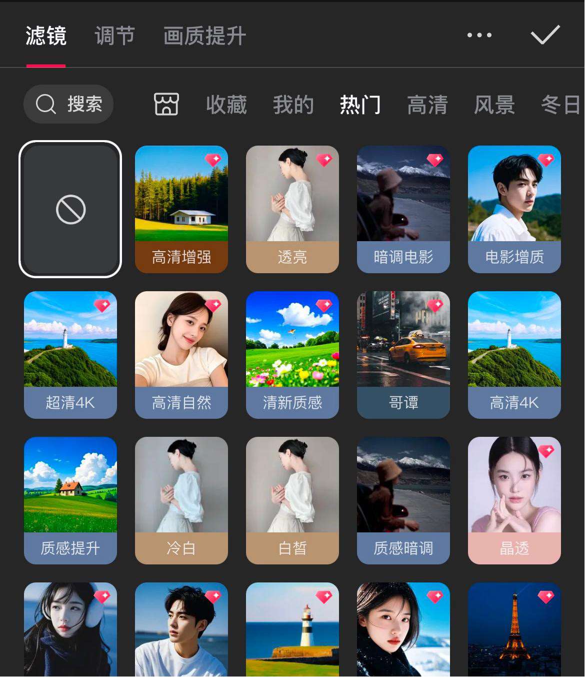 滤镜功能方面,剪映移动版内置了多种风格各异的滤镜,如电影增质、高清自然、清新质感等,能够迅速转变视频的整体风格与氛围,如图3-1所示。用户可以根据视频的主题和情感氛围选择合适的滤镜,例如,使用“电影增质”滤镜能增强画面的对比度和色彩饱和度,赋予视频更多层次感和立体感,而使用“清新质感”滤镜可以为自然风光和旅行视频增添一种清新的美感。此外,滤镜还能在一定程度上掩盖视频中的小瑕疵,如光线问题或色彩不够鲜艳等,使视频呈现更加完美的状态。