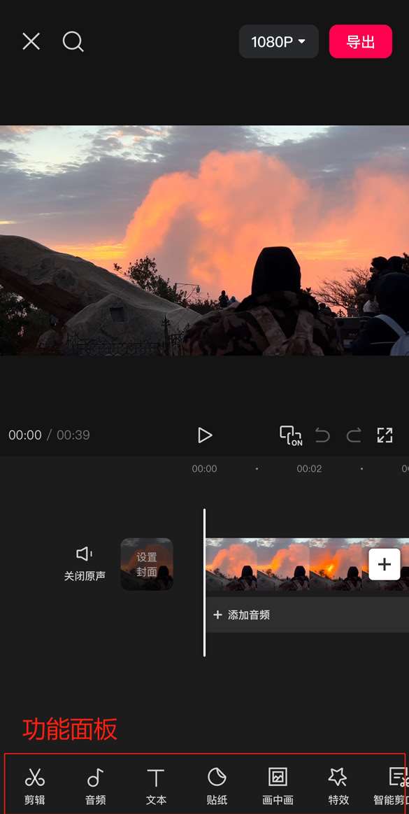 (3)功能面板:位于屏幕的最下方,通过左右滑动可以查找更多的功能,如图1-4所示。功能面板包含了丰富的剪辑工具,如分割、变速、倒放、音量调节、变声、降噪等,以及音频工具、文本工具、贴纸工具、画中画工具、特效工具等,方便用户对视频进行各种编辑处理。