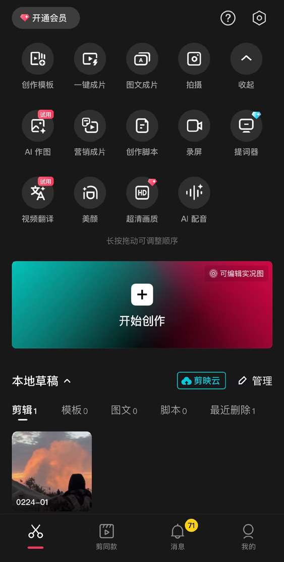 剪映移动版的操作界面简洁清爽、直观易懂,主要包括以下几个部分。