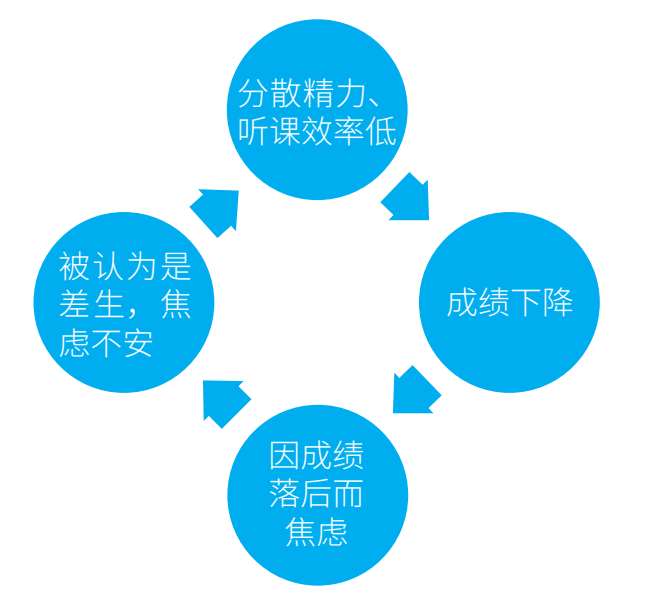 过度焦虑,会使孩子的学习形成恶性循环:孩子过度焦虑,难以集中精神,影响听课效率,导致学习成绩下降,进而出现更大的焦虑。