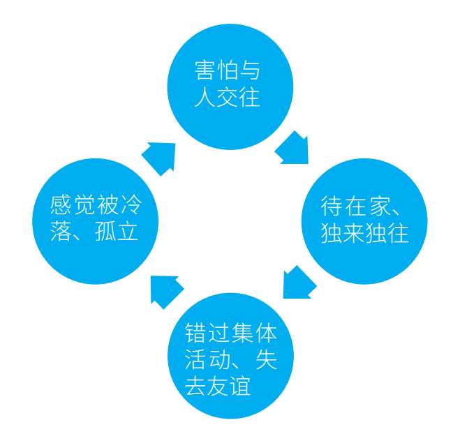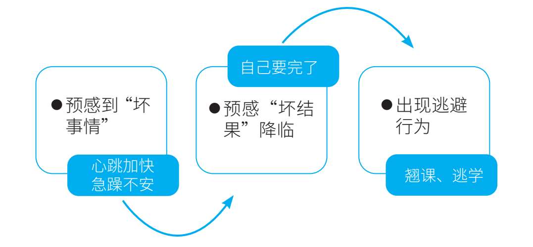 比如,当一个孩子预感到有“坏事情”要发生——在他看来这个“坏事情”可能是被当众点名回答问题,也可能是被要求上台演讲等,孩子的心跳就会加快,变得急躁不安,随后消极地认为会发生被所有同学嘲笑的“坏结果”。为此,他选择逃避,可能做出翘课、逃学等行为。