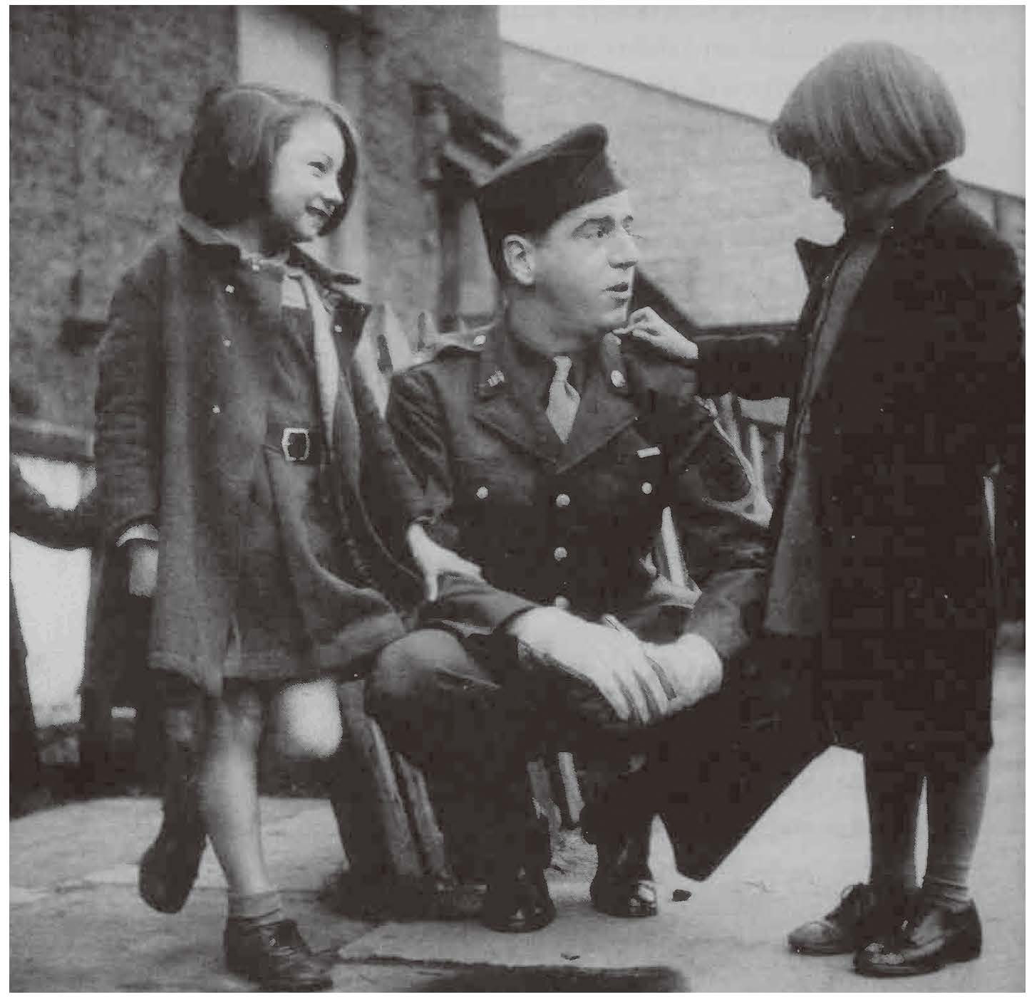 ↑伦敦,1943年1到2月。一位美国官员在逗他的兵营“领养”的战争孤儿。