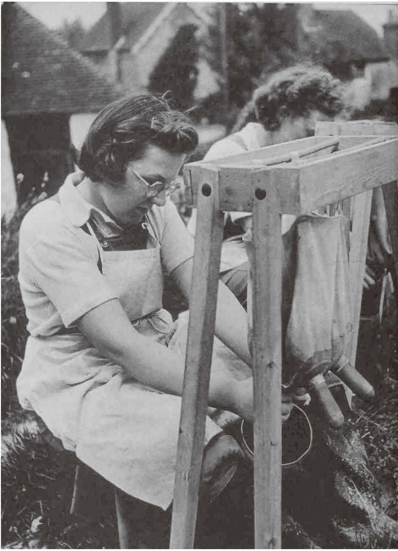 ↑英国哈德福郡,1942年。为了赢得战争,一位前伦敦百货公司的职员正在接受训练,成为挤奶工。