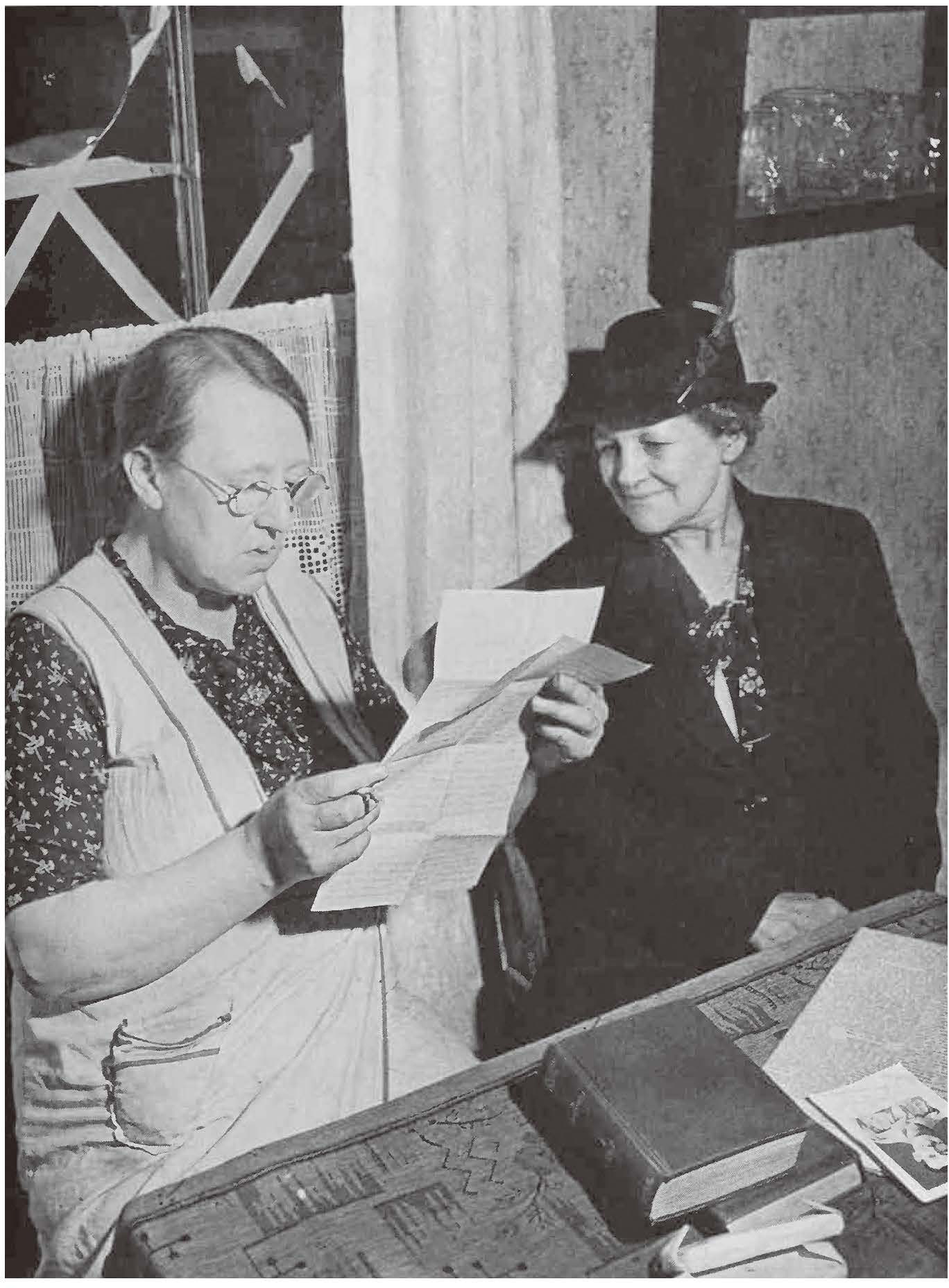 ↑伦敦,1941年6至7月,一位母亲在朗读她应征入伍的儿子的信(注意他的照片,在右下角)。