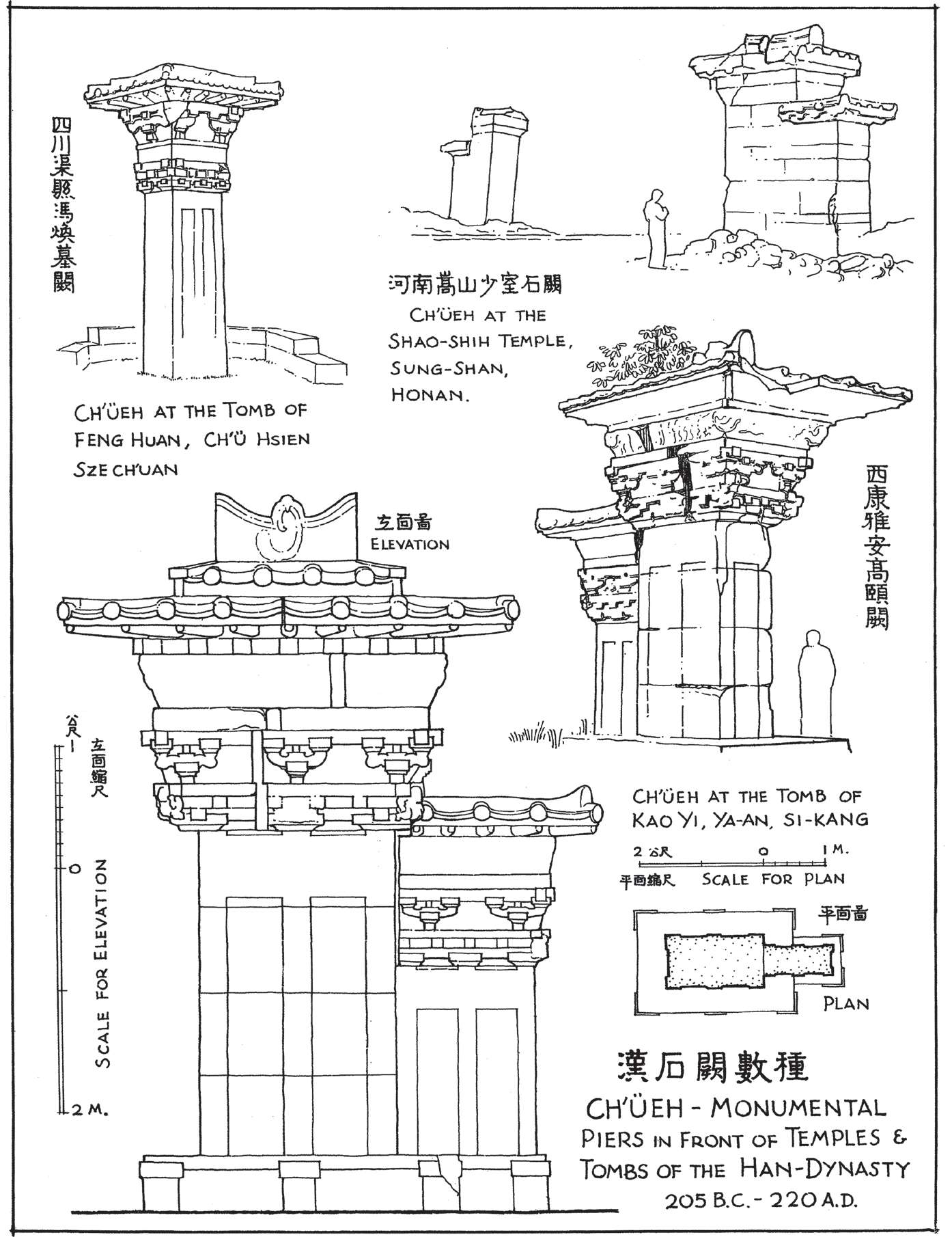 汉宫殿祠庙陵墓门外两侧多立双阙,或木构,或石砌;木阙现已无存,石阙则实例颇多,均为后汉物。阙身形制略如碑而略厚,上覆以檐;其附有子阙者,则有较低较小之阙,另具檐瓦,倚于主阙之侧。