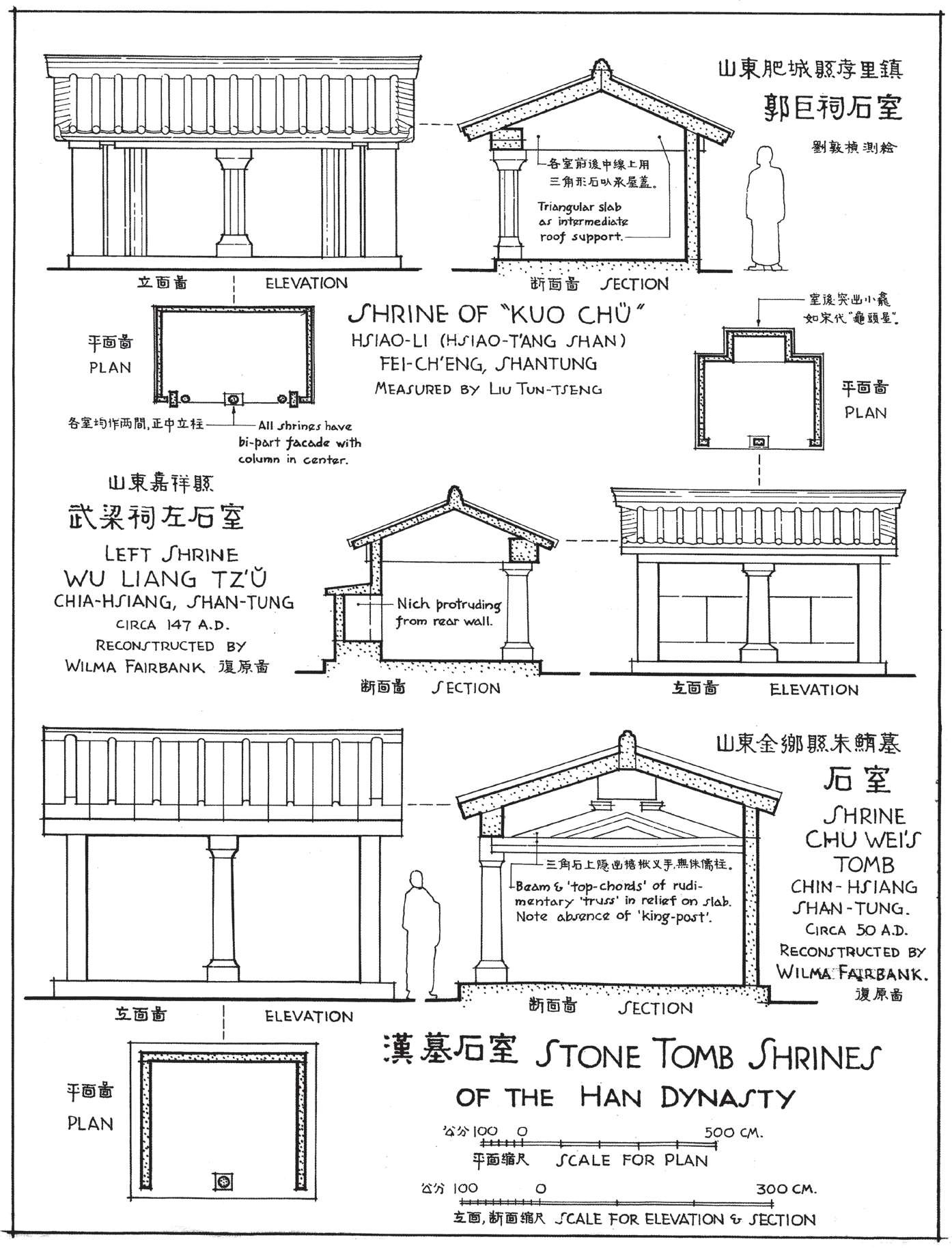 汉墓石室见于文献者甚多,然完整尚存者,仅山东肥城县孝堂山“郭巨”墓祠一处 4 。石室通常立于坟丘之前。室平面作长方形,后面及两山俱有墙,正面开敞,正中立八角石柱一,分正面为两间。屋顶“不厦两头造”,即清式所称悬山式,上施脊,瓦陇瓦当均由石块上刻成。著名之“武氏祠画像石”实为石室之毁后散乱者。美国费慰梅 5 (Wilma C.Fairbank)就现存石之拓本,归复原状,不唯藉知各画石之原位置及室内壁面画像之图案,且得以推知石室之结构及原形与“郭巨洞”相同,正面中间立一柱,且有后部另有小龛突出如后世所谓龟头者[见注3]。