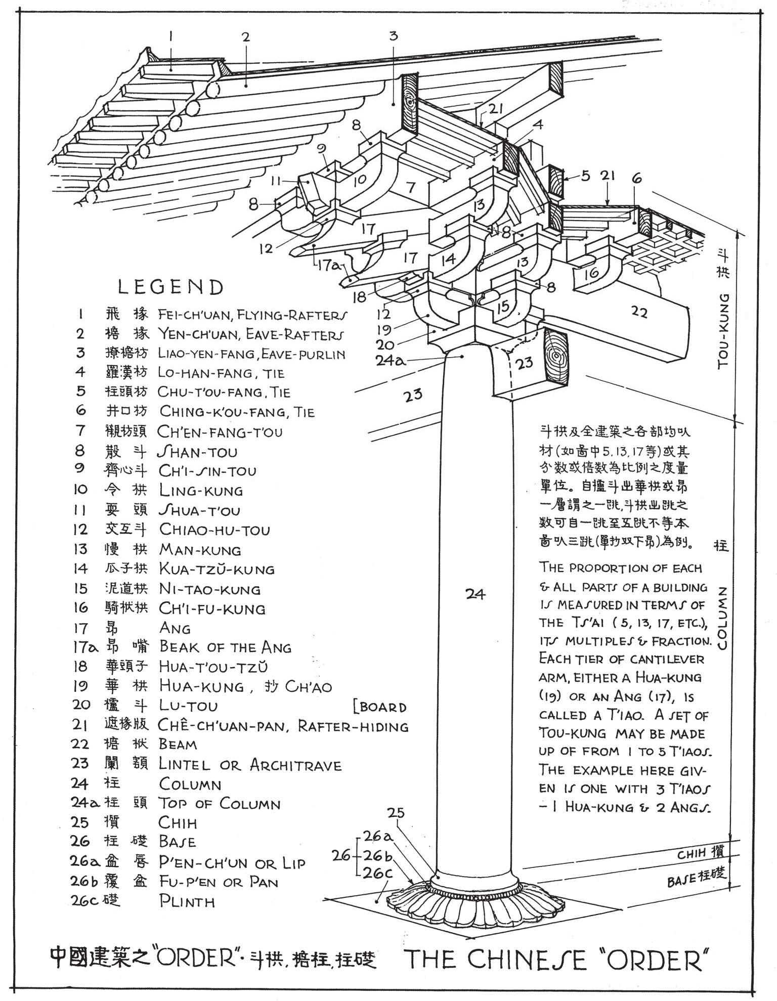 (三)以斗拱为结构之关键,并为度量单位。 在木构架之横梁及立柱间过渡处,施横材方木相互垒叠,前后伸出作“斗拱”,与屋顶结构有密切关系。其功用在以伸出之栱承受上部结构之荷载,转纳于下部之立柱上,故为大建筑物所必用。后世斗栱之制日趋标准化,全部建筑物之权衡比例遂以横栱之“材”为度量单位,犹罗马建筑之柱式(Order)以柱径为度量单位,治建筑学者必习焉。一系统之建筑自有其一定之法式,如语言之有文法与辞汇,中国建筑则以柱额、斗栱、梁、槫、瓦、檐为其“辞汇”,施用柱额、斗栱、梁、槫等之法式为其“文法”。虽砖石之建筑物,如汉阙、佛塔等,率多叠砌雕凿,仿木架斗栱形制。斗栱之组织与比例大小,历代不同,每可藉其结构演变之序,以鉴定建筑物之年代,故对于斗栱之认识,实为研究中国建筑者所必具之基础知识。