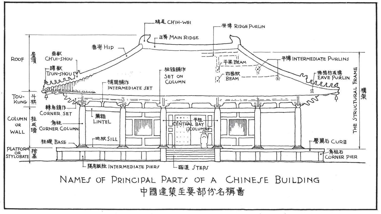 (二)历用构架制之结构原则。既以木材为主,此结构原则乃为“梁柱式建筑”之“构架制”。以立柱四根,上施梁枋,牵制成为一“间”(前后横木为枋,左右为梁)。梁可数层重叠称“梁架”。每层缩短如梯级,逐级增高称“举折”,左右两梁端,每级上承长槫,直至最上为脊槫,故可有五槫,七槫至十一槫不等,视梁架之层数而定。每两槫之间,密布栉篦并列之椽,构成斜坡屋顶之骨干;上加望板,始覆以瓦葺。四柱间之位置称“间”。通常一座建筑物均由若干“间”组成。此种构架制之特点,在使建筑物上部之一切荷载均由构架负担;承重者为其立柱与其梁枋,不藉力于高墙厚壁之垒砌。建筑物中所有墙壁,无论其为砖石或为木板,均为“隔断墙”(Curtain Wall),非负重之部分。是故门窗之分配毫不受墙壁之限制,而墙壁之设施,亦仅视分隔之需要。欧洲建筑中,唯现代之钢架及钢筋混凝土之构架在原则上与此木质之构架建筑相同。所异者材料及科学程度之不同耳。中国建筑之所以能自热带以至寒带;由沙漠以至两河流域及滨海之地,在极不同之自然环境下始终适用,实有赖于此构架制之绝大伸缩性也。