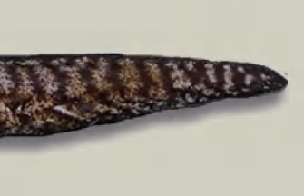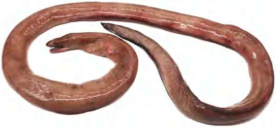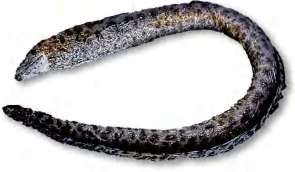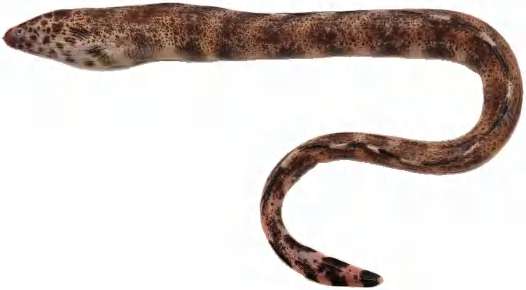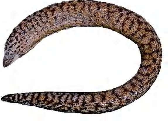 形态特征│ 体延长而呈圆柱状,尾部侧扁。吻短而钝;颌齿单列,颌间齿为2~3个可倒伏的尖牙。脊椎骨数125~128。幼鱼体暗褐色,略带红紫,成鱼体色由黄褐色至红褐色。皮肤光滑且具特色花纹,缺乏胸鳍腹鳍及鳞片。