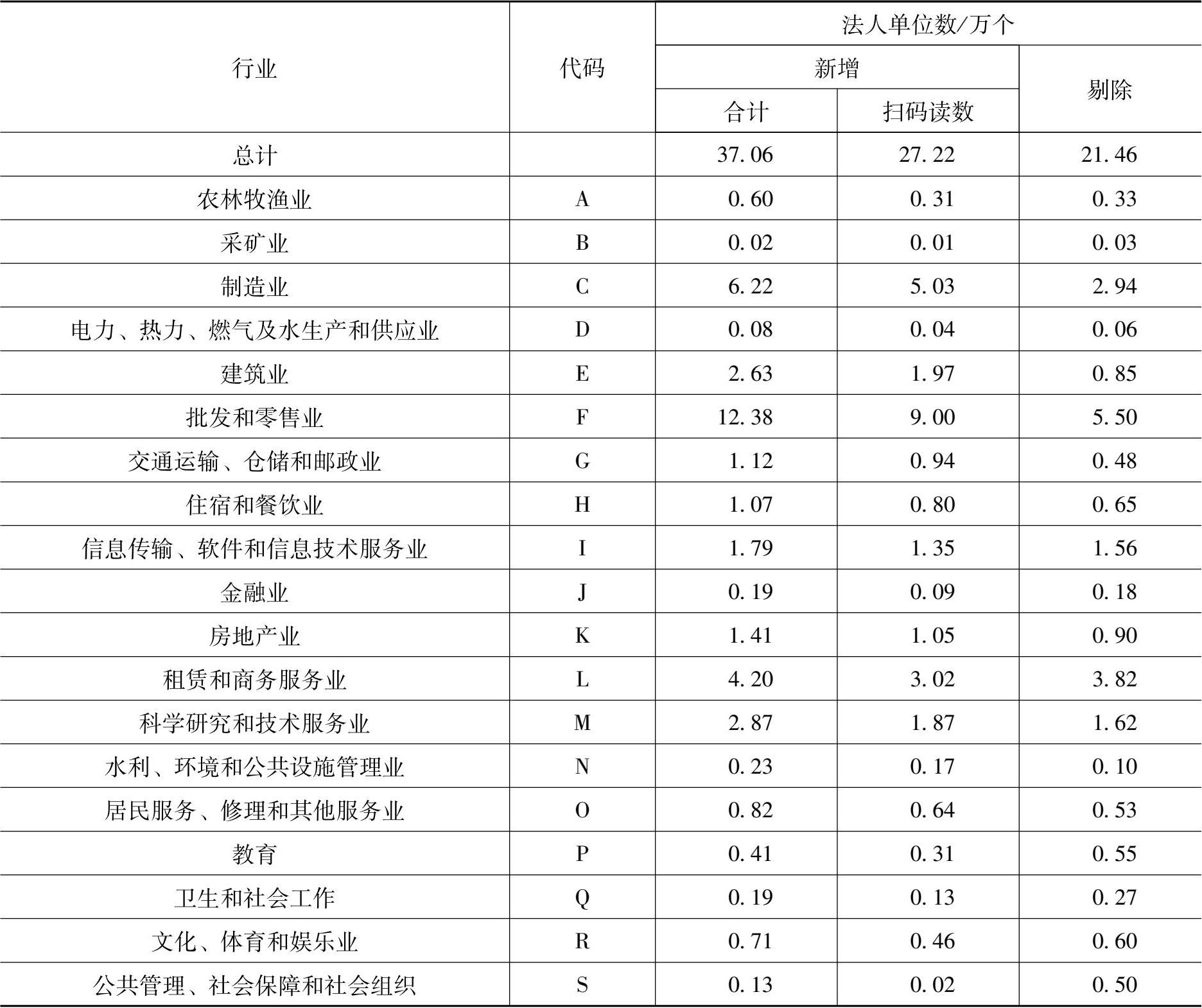 表1.29 2022年四季度按行业分组的新增和剔除法人单位情况