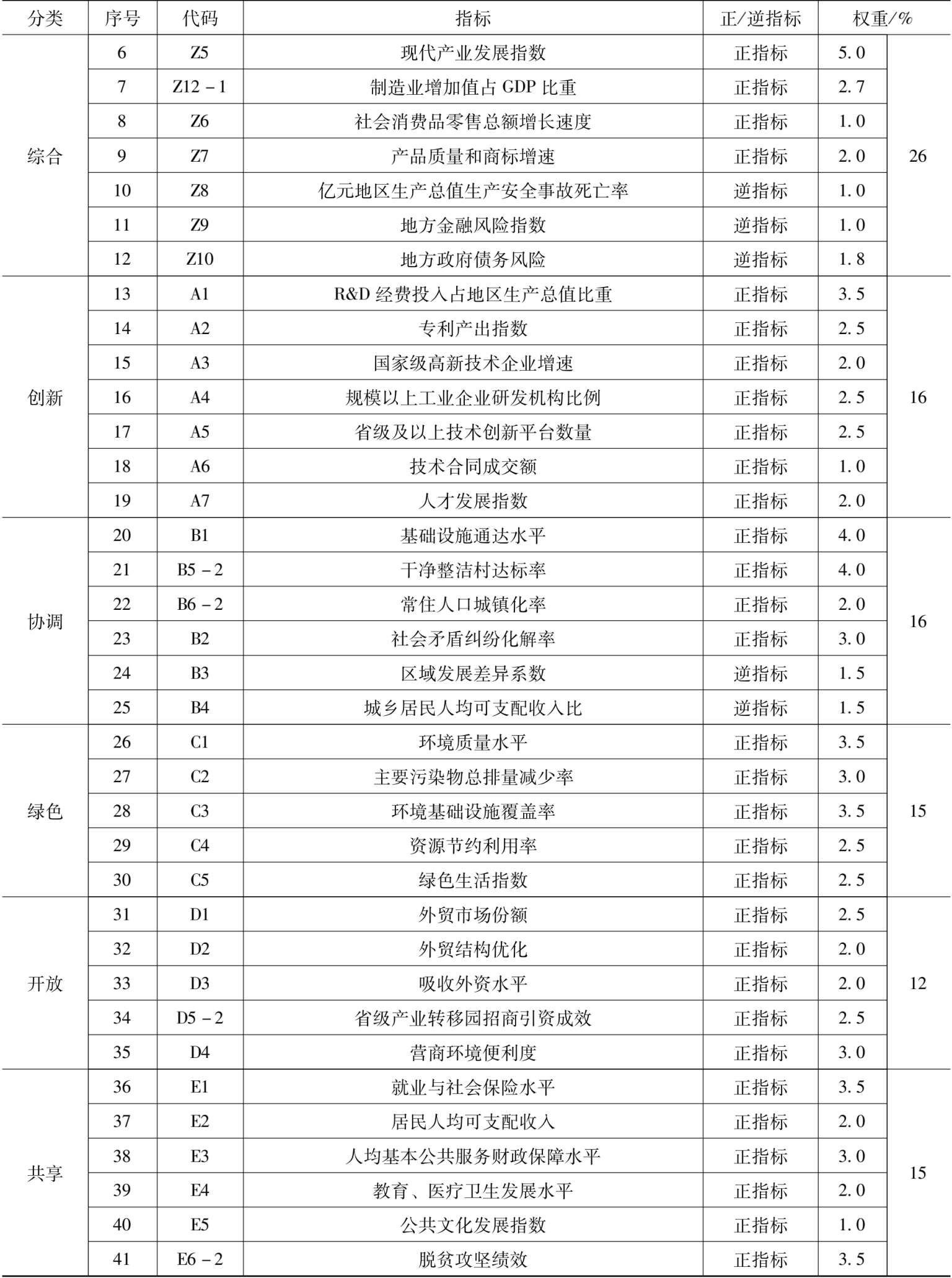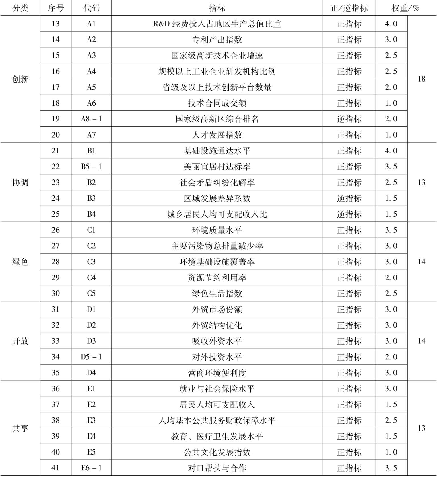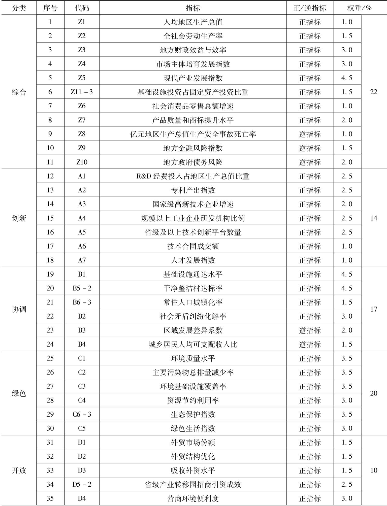 四是对应性与可比性原则。高质量发展评价体系根据3类区域分为3个指标体系,3个指标体系均有41个指标,其中适用于3类区域的共同指标有35个,适用于不同区域的类别指标有12个。为使评价结果具有可比性,二级指标权重的设置要一一对应,不可差别过大。