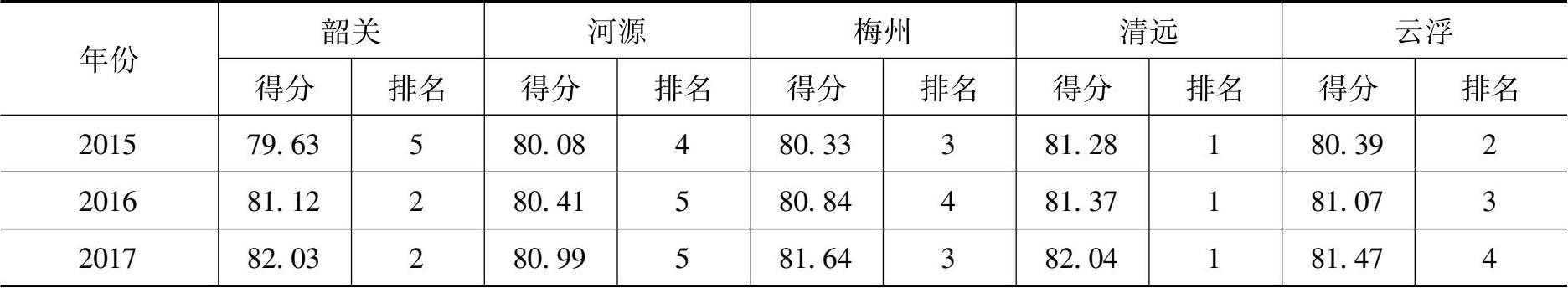 3.粤北部生态发展区的测算评价结果。粤北部生态发展区为广东较为欠发展的地区。近3年,北部生态发展区高质量发展变化表现为“一稳一升二降一波动”。“一稳”指清远排位稳定,连续3年均居第1位。“一升”指韶关从2015年第5位上升至2017年第2位。“二降”指云浮从2015年第2位下降到2017年第4位,河源从2015年第4位下降到2017年第5位。“一波动”指梅州近3年位次均有所变动。具体见表1.10。