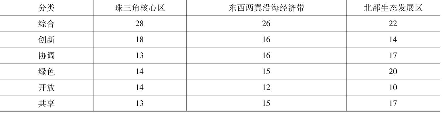 。通过反复分类筛选与比较,集成一个能较好反映高质量发展综合绩效评价指标体系,具体可见表1.1至表1.3。其最大的考虑是“实事求是”,务实、可用、可操作寻求内在规律变化;最大的特点是“分类评价”,一套指标体系突出“1+5”41 个指标,既有反映区域共性发展的指标,也有体现区域个性发展的指标,分别适用于评价珠三角核心区9 个市、沿海经济带东西两翼7个市、北部生态发展区5个市的高质量发展状况。