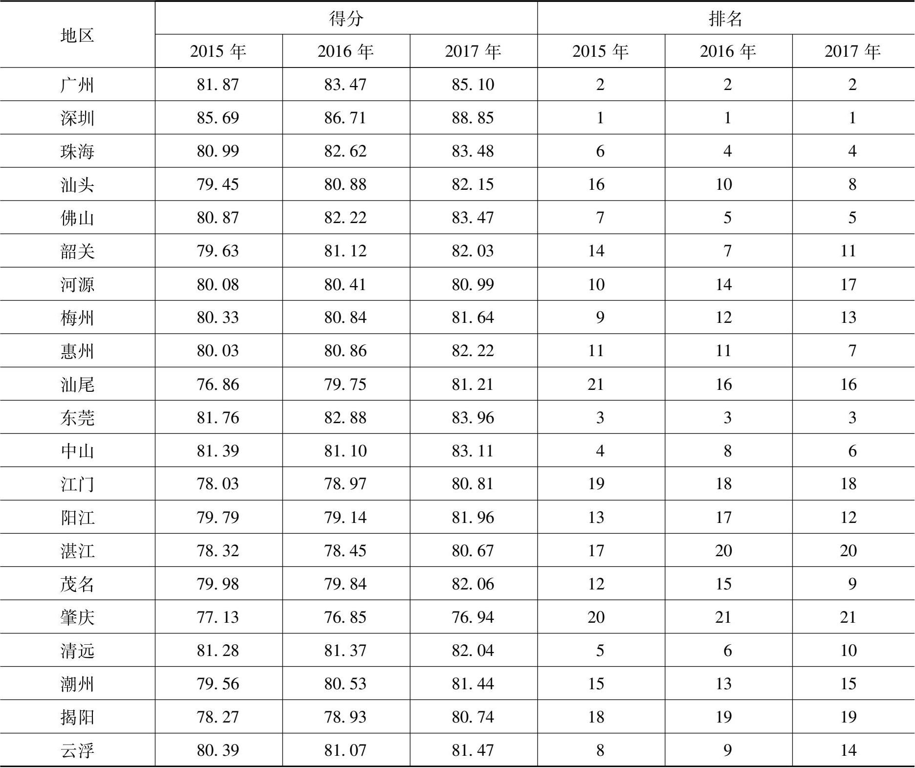 以深圳为例,其高质量发展结果连续居珠三角首位。2015—2017 年总评分为85.69、86.71、88.85,3年居第1名;综合、创新、开放3项为其优势指标,3年均居第1位;共享为进步指标,从3年前的第7位升到2017年的第1位;相对劣势指标为协调、绿色。具体情况见表1.7。