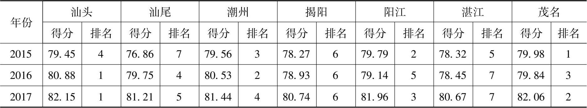 2.粤东西两翼沿海经济带的测算评价结果。通过对评价结果的分析,可知2015—2017 年东西两翼沿海经济带高质量发展的主要特点为“一升一稳一降四波动”。“一升”指汕头排位从2015 年第4位上升到2017年第1位;“一稳”指揭阳排位连续3年居第6位;“一降”指湛江排位从2015年第5位下降到2017年第7位;“四波动”指汕尾、潮州、阳江、茂名近3年位次均有所波动。需要引起关注的是,绿色指数的最高分和最低分的差距最大,协调指数的最高分和最低分的差距次之,且呈扩大态势。具体见表1.9。