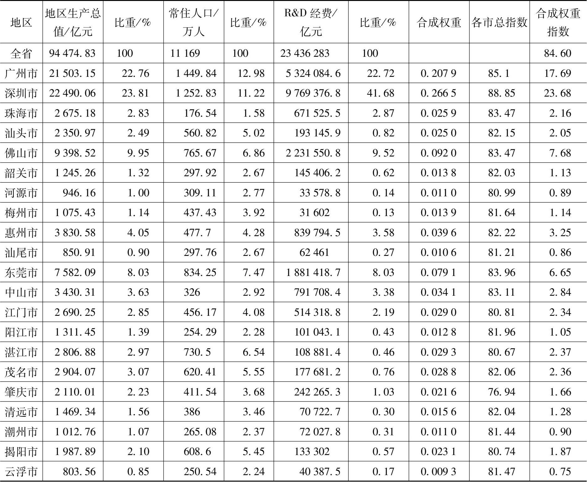 其主要具体计算与合成过程如下。首先,根据分地市的地区生产总值占全省比重为50%,全社会研发经费投入(R&D经费)占全省比重为30%,常住人口占全省比重为20%,计算出该地市的合成权重。其次,将该地市的合成权重乘以该地市测算出的高质量发展的总指数,从而得出该地市的合成权重指数。最后,把21个地市的合成权重指数相加,得到全省总指数。通过计算,2015 年广东全省高质量发展绩效总指数为81.60,2016年的为82.95,2017年的为84.60,从广东全省高质量发展总指数发展的数值和趋势看,与近3年的客观实际增长相吻合,全省与各市高质量发展的总体变化趋势一致。具体可见表1.11(2015年、2016年表相同,特略去)。