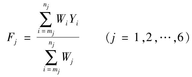 其中,F j 为第j个分类指数,Y i 为指标X i 的个体指数,W i 为第i个指标X i 的权数,m j 为第j个分类中第一个评价指标在整个评价体系中的序号,n j 为第j个分类中最后一个评价指标在整个评价体系中的序号。