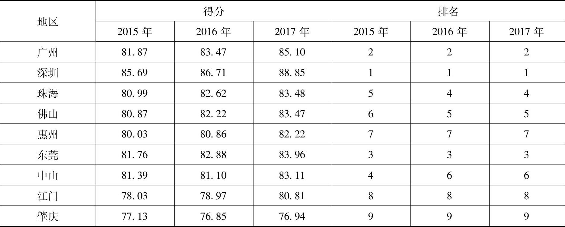以深圳为例,其高质量发展结果连续居珠三角首位。2015—2017 年总评分为85.69、86.71、88.85,3年居第1名;综合、创新、开放3项为其优势指标,3年均居第1位;共享为进步指标,从3年前的第7位升到2017年的第1位;相对劣势指标为协调、绿色。具体情况见表1.7。