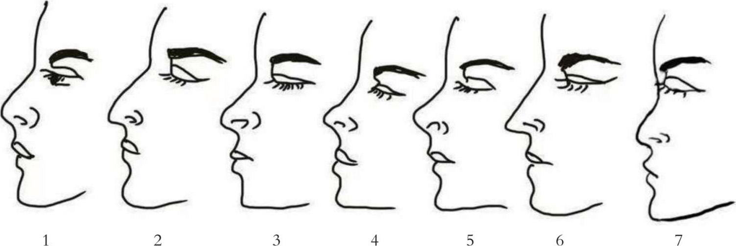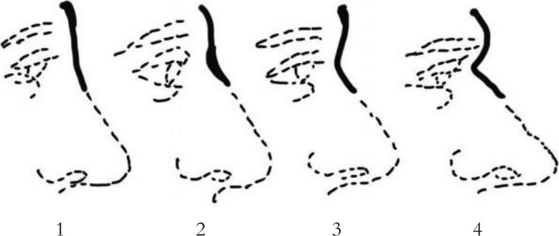 从鼻根点的侧面看,可根据鼻根点凹陷程度将其分为4级:鼻根点无凹陷为零级;鼻根点略有凹陷为一级;鼻根点有明显凹陷为二级;额骨与鼻骨相连处有明显的转折为三级(图3-7)。