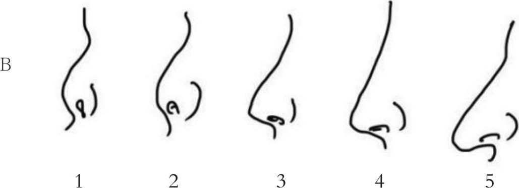 B.直形鼻背:1.鼻背偏短,鼻根低平,鼻尖朝上,鼻基部向前上方;2.鼻背长度中等,鼻根稍高,鼻尖朝上,鼻基部向前上方;3.鼻背长度中等,鼻根高度中等,鼻尖略朝前上方;4.鼻背稍长,鼻根偏高,鼻尖朝前,鼻基部水平;5.鼻背长度中等,鼻根高度中等,鼻尖朝下,鼻基部向前下方。