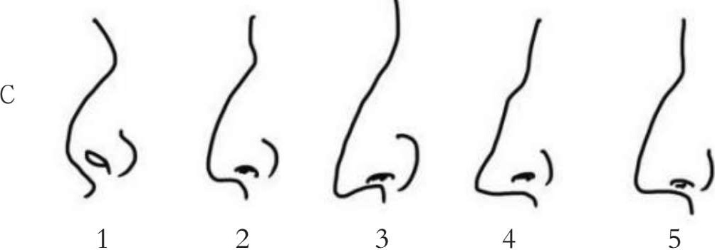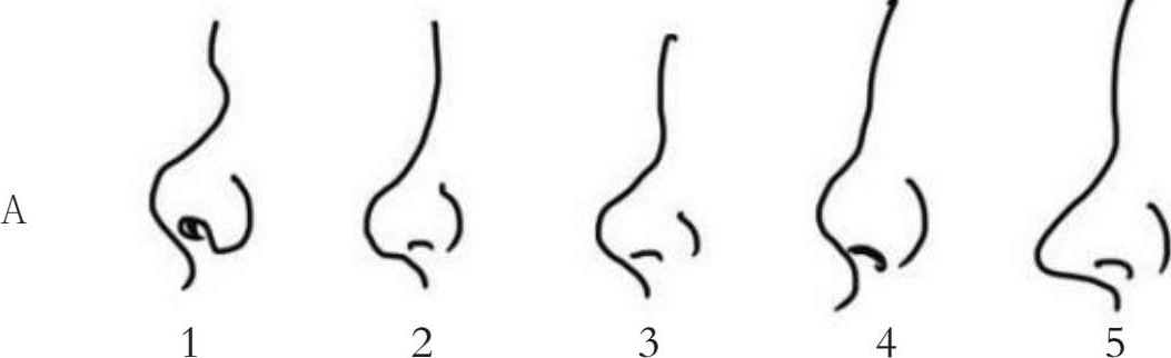C.凸形鼻背:1.鼻背偏短,鼻根低平,鼻尖朝上,鼻基部向前上方;2.鼻背长度中等,鼻根高度中等,鼻尖朝前,鼻基部稍向前上方;3.鼻背较长,鼻根高度中等,鼻尖朝下,鼻基部向前下方;4.鼻背稍长,鼻根高度中等,鼻尖朝下,鼻基部稍向前下方;5.鼻背较长,鼻根高度中等,鼻尖朝前,鼻基部水平。