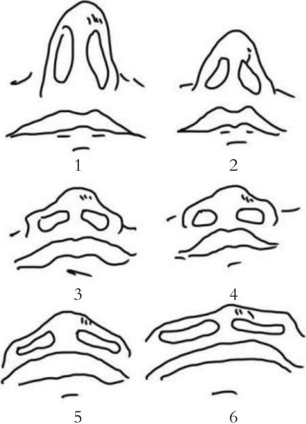1.椭圆形鼻孔(鼻孔最大径为纵向);2.三角形鼻孔(鼻孔最大径为斜向);3.圆形鼻孔(鼻孔最大径为斜向);4.圆形鼻孔(鼻孔最大径为横向);5.椭圆形鼻孔(鼻孔最大径为斜向);6.椭圆形鼻孔(鼻孔最大径为横向)。