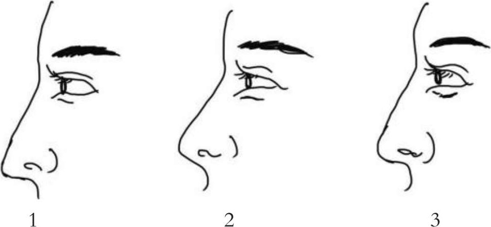 从鼻根点的侧面看,可根据鼻根点凹陷程度将其分为4级:鼻根点无凹陷为零级;鼻根点略有凹陷为一级;鼻根点有明显凹陷为二级;额骨与鼻骨相连处有明显的转折为三级(图3-7)。