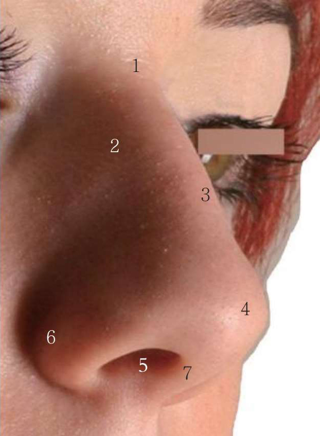 1.鼻根;2.鼻背;3.鼻梁;4.鼻尖;5.鼻孔;6.鼻翼;7.鼻中隔。