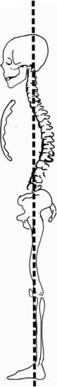 从人体的侧面观察,人体并非笔直,脊柱具有4个明显的弯曲,即颈曲、胸曲、腰曲和骶曲,其中胸曲、骶曲弧度向后为先天形成,即胚胎时期脊柱呈现团缩状,出生后随着人体的发育和生存需求增加,后天形成弧度向前的颈曲和腰曲,从而使人头部抬起,并能坐起且直立,并使人体的重力能够顺利传递到足部。以成年人的侧面观作重力线(图2-3),以此为基准可见,胸上部、臀部、小腿凸向后,位于重力线后,而头、胸中部、胸下部、腹部和股部大部分区域位于重力线前,即人体大部分重心位于重力线前,而脊柱的4个生理性弯曲对于这种偏重现象发挥了一定的调整作用。但是为了维持直立时的平衡,人体的背部肌肉必须间歇性收缩,即从前往后拉动人的重量,因此久站容易导致人体的背、腰部肌肉疲劳。
