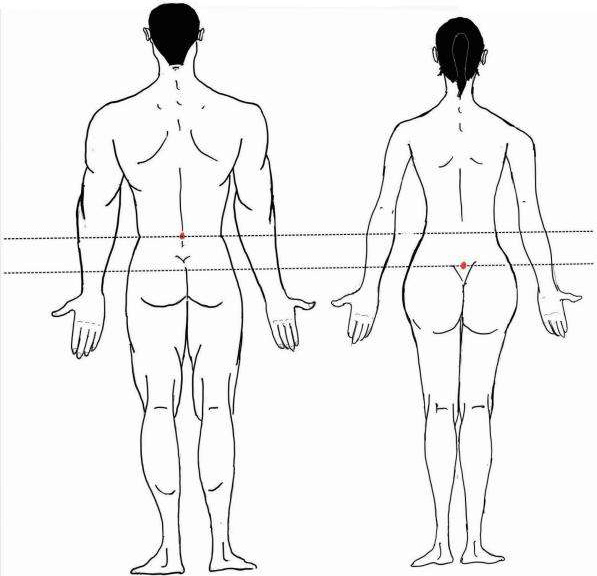 人体的重心并非固定,通常成年人平均重心位于第2骶椎前方约7 cm处,即髋关节额状轴的后方且高于此轴4~5 cm。而受到人体的食物摄入、消化,呼吸,血液循环等因素影响,人体的重心会呈现动态变化。如吸气膈肌下降,重心随之下降;呼气膈肌上升,重心也随之上移。因此呼吸作用可使得人体重心在5~10 mm间上下摆动。而不同年龄、性别和不同体形的人,重心也有差别(图2-4)。女性因为骨盆发育特点,其重心较低。儿童头身比例大,因此重心较成人要高。