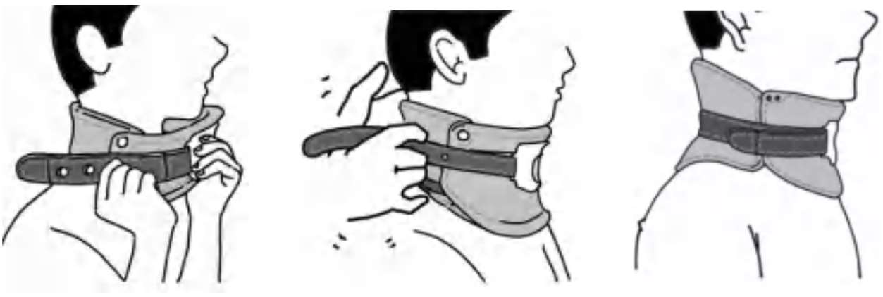 先将颈托放置于颈后部,一手固定颈托后部,然后调整前托位置,将下颌放到前托的下颌窝里,最后调节松紧度,固定粘扣。