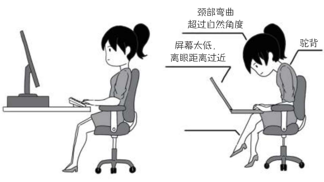 生活和工作中的不良坐姿是造成颈部慢性劳损的主要原因之一。有的人在看电脑时,脖子过度向前屈曲,含胸驼背,时间一长就容易出现颈部周围肌肉的不平衡,导致颈椎劳损;还有些人在看电视时,喜欢在沙发上“葛优躺”。这些姿势容易造成颈椎扭伤,如果长时间保持这种错误的姿势,还会出现头痛、头晕和眼睛不适等症状,并加速颈椎的椎间盘退变。因此,在日常生活中一定要记得保持正确的坐姿。坐下时,应保持自然的端坐,颈肩部放松,两侧肩部后展,脊柱保持正直,避免头颈部过度前倾或后仰。