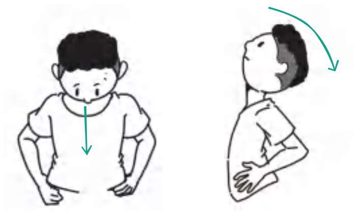 双手叉腰,肩膀放松,低头看地面将下巴向前胸靠近,然后回到中位,再抬头后仰,动作宜缓慢协调,避免速度过快和力量太大导致拉伤。前后各1次为1组,每天早、中、晚各3组。