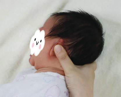 (1)用左手拇指及中指(或示指)将婴儿 双耳郭反折向前 并轻轻按住(目的为堵住外耳道,防止浴水进入耳内)(图1-44)。