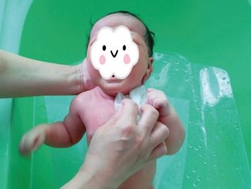 3.用单层小毛巾或棉球擦洗婴儿双眼(方向 由内眦向外眦 )、前额、鼻、面部、耳部,用水湿润头发及全身,再用婴儿专用沐浴液搓出泡沫,涂在婴儿头、颈、上肢、腋下、躯干、腹股沟、臀部及下肢,用浴水冲净。