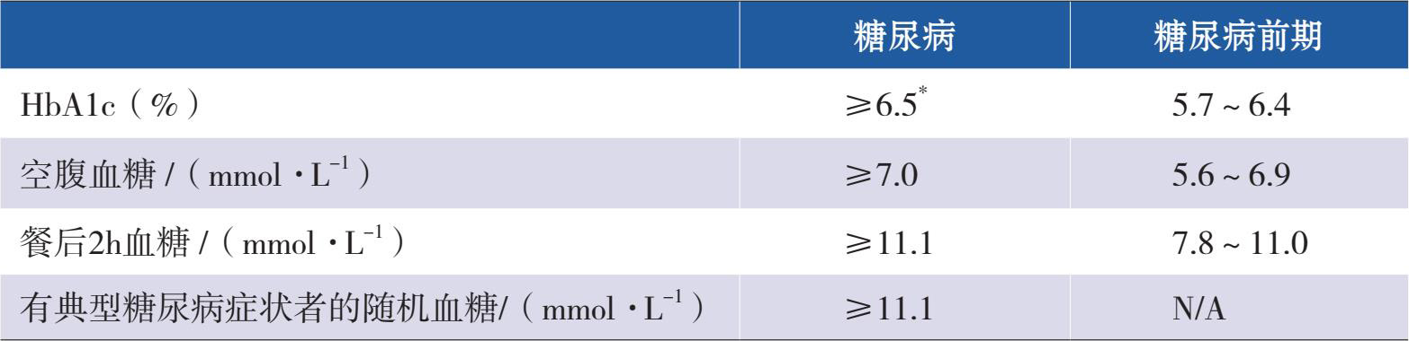 * 糖化血红蛋白的检测方法需有NGSP认证且有DCCT检验标准。如果没有明确的高血糖,应重复检测对结果确认。