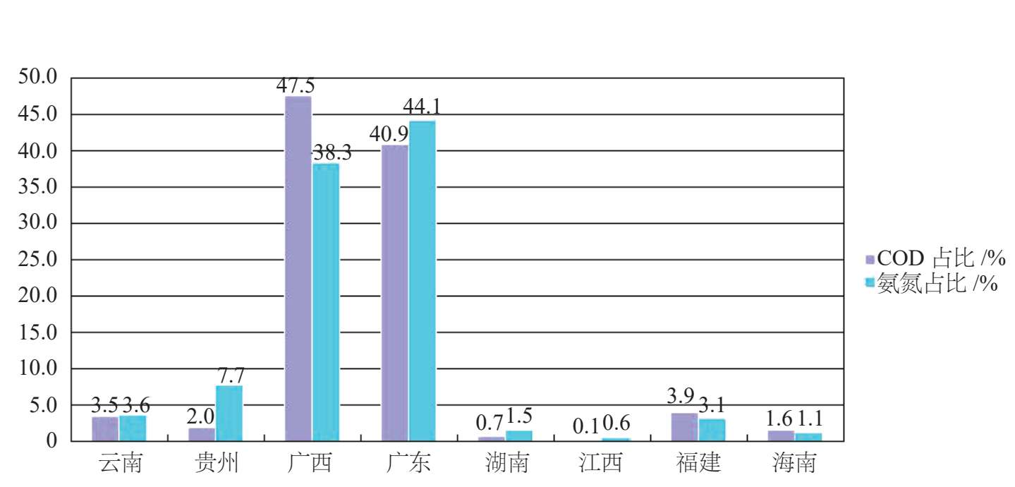 针对南盘江滇桂缓冲区、寻乌水赣粤缓冲区等 45 个省界缓冲区,在上述一般性分解原则的基础上,分左右岸、上下游两种情况分别进行省(区)限排总量分解。