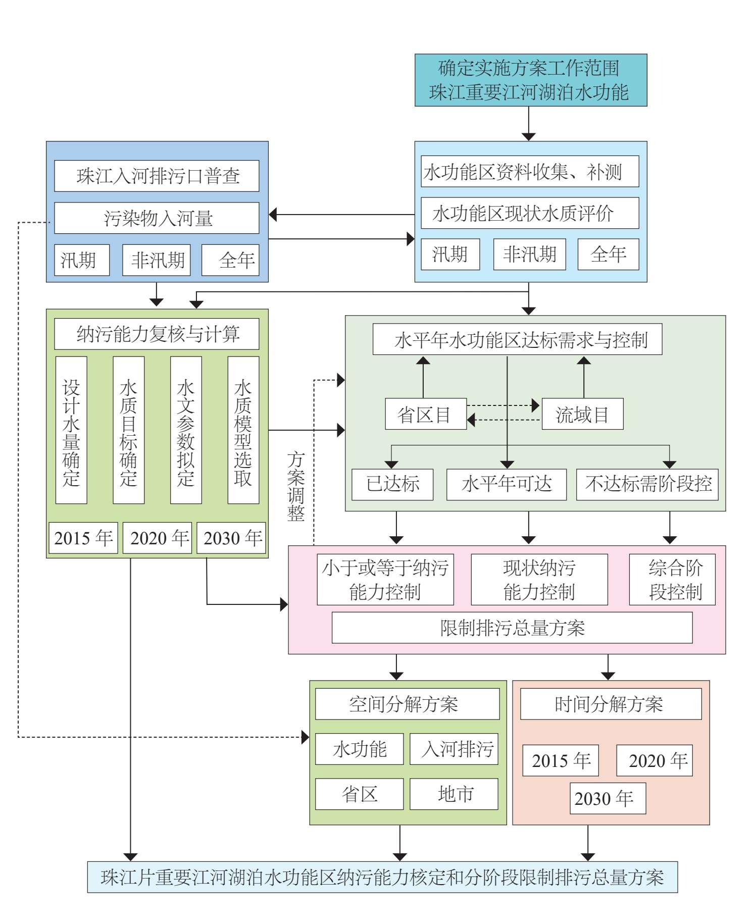 珠江片重要江河湖泊水功能区分阶段限制排污总量分解技术路线见图2-3。