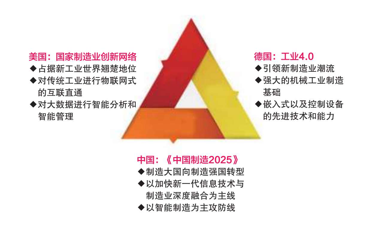 在近几年比较重要的国家级产业升级计划(图2-2)中,无论是中国的《中国制造2025》、美国的“国家制造业创新网络”,还是德国的“工业4.0”,都把制造业作为重点升级的对象。在我国工业和信息化部公布的《2015年智能制造试点示范专项行动实施方案》一文中,可以找到对智能制造的定义:基于新一代信息技术,贯穿设计、生产、管理、服务等制造活动各个环节,具有信息深度自感知、智慧优化自决策、精准控制自执行等功能的先进制造过程、系统与模式的总称。而美国智能制造创新研究院对智能制造的定义是:智能制造是先进传感、仪器、监测、控制和过程优化的技术和实践的组合,它们将信息和通信技术与制造环境融合在一起,实现工厂和企业中能量、生产率、成本的实时管理。