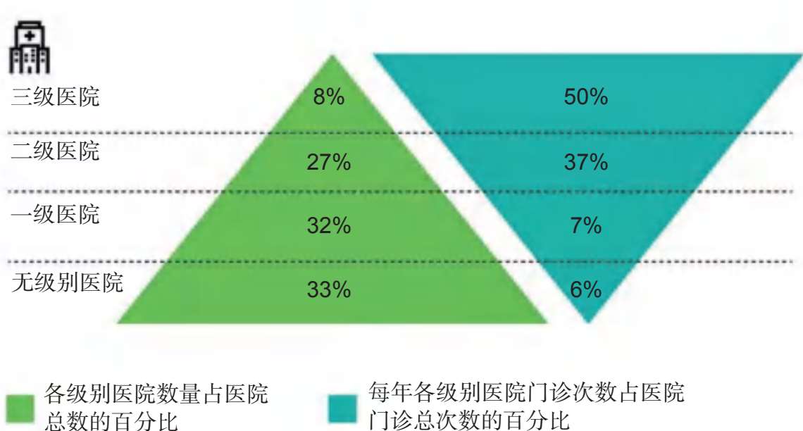 医疗资源总量不足、分布失衡(图1-6),医护人员缺口大,卫生发展落后于经济发展是我国目前医疗卫生事业发展的主要问题。我国约80%的医疗资源都集中在城市,城市医疗资源中又有约80%集中在大医院,广大农村及偏远地区缺医少药现象突出,城乡居民患者就诊往往需要长途奔波,采取异地就医、向上级医院集中的策略。城市中心区域医院医疗资源被小病、常见病患者牢牢占据,人满为患,这也是造成“看病难、看病贵”及等候时间长的主要原因。