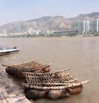早在远古时代,由于生产力水平低下,人们为了生存,往往沿着河流居住,以渔猎为生。在和大自然搏斗的过程中,先民观察大自然,发现树叶可漂浮在水面上,从而受到启发,发明了船。由此开启了水上交通。刘向整理的《世本》说到“古者观落叶因以为舟”。《淮南子·说山训》中也有类似的说法:“古人见窾木浮而知为舟”。《淮南子·物原》中记载“燧人氏以匏济水,伏羲氏始乘桴”,是指在上古时代,燧人氏抱着葫芦,以此为浮具过河,后来伏羲氏乘筏渡河。据考证,筏在新石器时代已经出现,古代人民利用当地的资源就地取材,从而出现了各种形式的筏,如在桂林漓江上的竹筏,九曲黄河上的羊皮筏,如图1-1所示。到了商朝,中国已掌握造船技术,并学会使用风帆。两宋时期,造船业成就斐然,广州、泉州、明州的造船业在当时居于世界领先地位,南宋沿海地区制造的海船,载重一般有数百石至五千石(一石约合55kg),最大载重量可达万石,海船设置了水密隔舱,增加了船只的抗沉性和横向强度,而且还配备了指南针。到了明朝,我国古代造船业走上了一个巅峰。郑和七次下西洋,据说最大的宝船搭载超过1 000人,是当时世界上最大、最先进的海船。