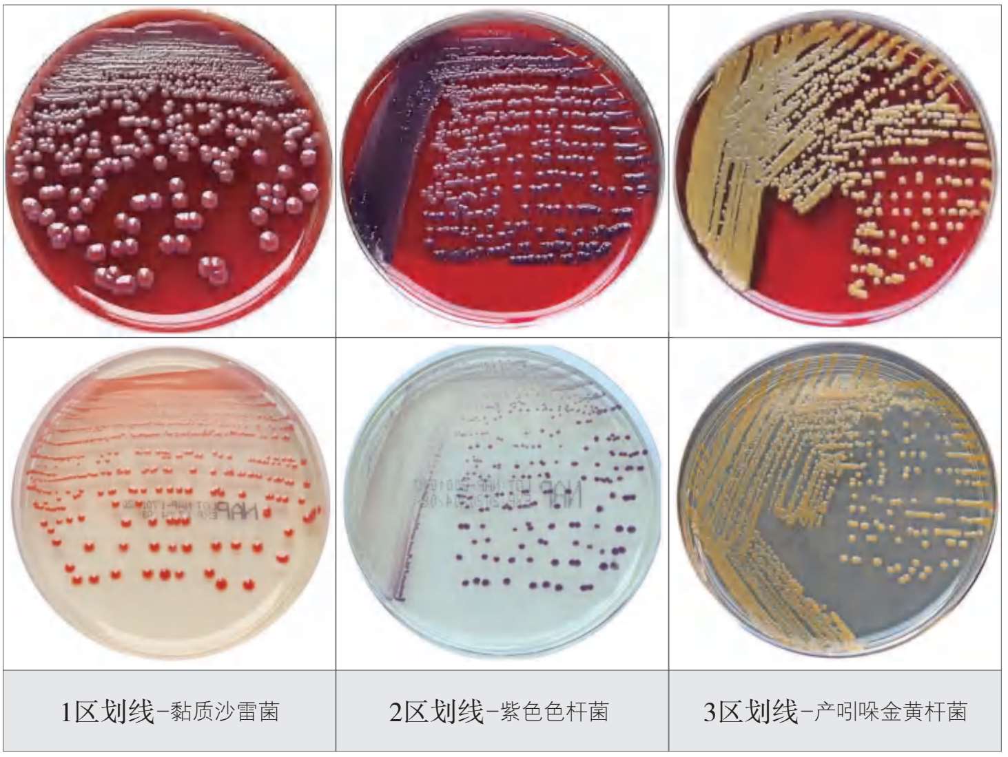 2.浅色平板中的Mueller-Hinton 平板仅接种铜绿假单胞菌,营养琼脂平板接种其他菌株。