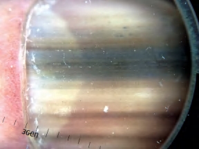 H.原位黑色素瘤皮肤镜下可见深黑色条带,颜色不规则,可出现或不出现哈钦森征阳性。怀疑该病时需要早期活检明确诊断,尽早治疗。