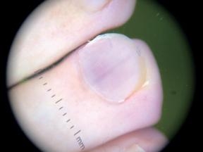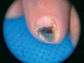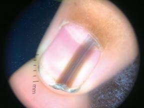 大部分甲下出血会持续伴随甲板的生长逐渐向远端移动。长期随访的患者可以用皮肤镜记录出血的位置,如病变逐渐向外生长,可明确甲下出血诊断。但部分血肿位置较深,有可能不随甲板长出。长时间存在并形成整个甲板纵行色变,需要做活检以排除肿瘤。