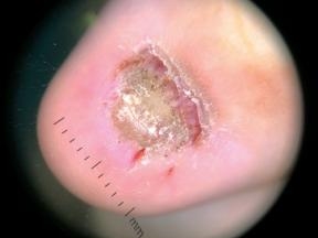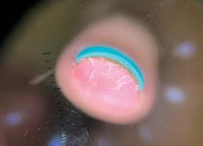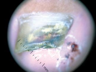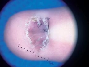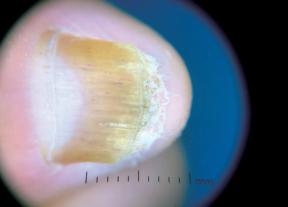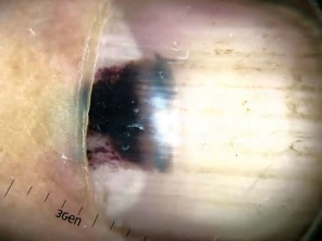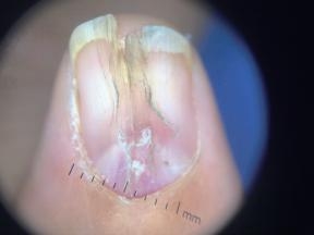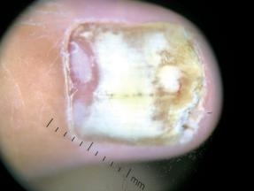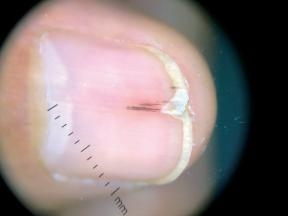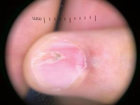 通过皮肤镜辨别原位黑色素瘤和侵袭性黑色素瘤是很困难的,但从不同的皮肤镜表现形式我们可以得到一些诊断线索,帮助确定是否需要活检,或采用的手术方式。如果为非黑色素细胞来源,则要分辨是否为外来色素,如染甲等。感染也可以引起色甲,最常见的如铜绿假单胞菌。非感染的原因,如甲下出血、原位或侵袭性鳞状细胞癌都可以导致甲颜色的改变。在甲单位形态的改变中甲板形态改变最常见。甲母质受累的炎性甲病和甲母质外伤均可引起甲板形态的改变。甲床的形态改变最常见的原因则是肿瘤和外伤。如果甲病变表现为甲板增厚和甲下角化过度,需使用皮肤镜观察甲床游离缘,明确甲床与甲板之间的变化。如果病变累及甲周组织,则需要观察甲周有无红斑脱屑(接触性皮炎)、粗糙隆起并伴有簇状出血点(疣),或甲皱襞的慢性炎症(湿疹、剔甲癖)。