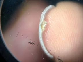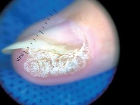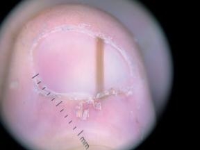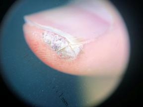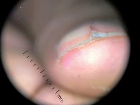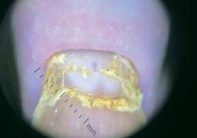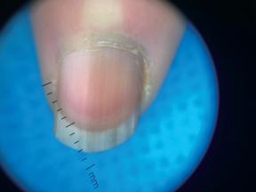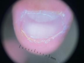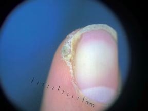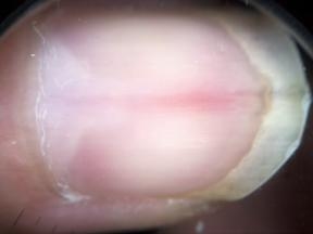 图2-4-7 人为习惯性损伤甲的皮肤镜下改变